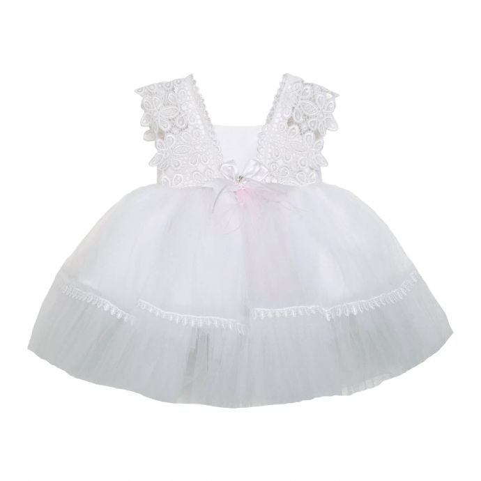 Βαπτιστικό φόρεμα από λευκές δαντελένιες τιράντες, σαντούκ λευκό μπούστο και λευκή τούλινη φούστα με βολάν.