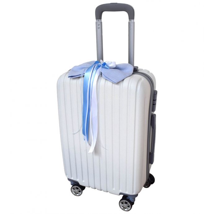 Βαλίτσα βάπτισης ταξιδιού σε λευκό χρώμα και διακοσμημένη από σιέλ φιόγκο και σιέλ λευκές κορδέλες.