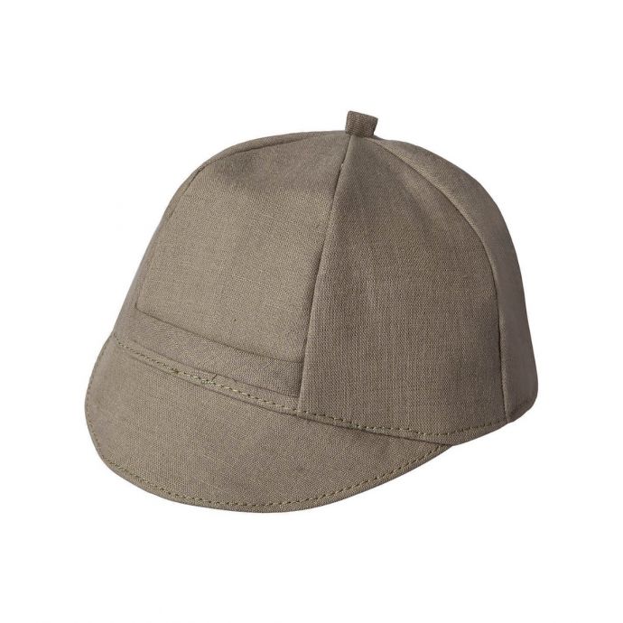 Υφασμάτινο καπέλο τύπου τζόκεϋ βάπτισης από λαδί λινό ύφασμα , ελληνικής παραγωγής.