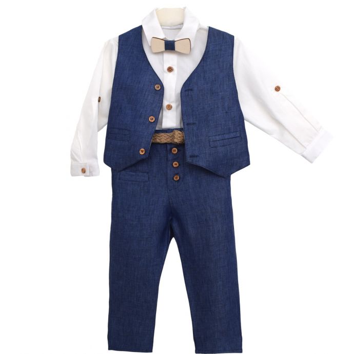 Βαπτιστικό ρούχο με εκρού βαμβακερό πουκάμισο, γιλέκο και παντελόνι λινά σε ραφ απόχρωση, σχοίνινη ζώνη και ξύλινο παπιόν.
