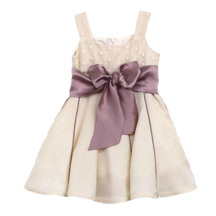 Βαπτιστικό φόρεμα από εκρού πουά σατέν, μωβ σατέν ρελάκια και ζώνη, και επενδυμένο μπούστο από εκρού δαντέλα. Μπολερό από εκρού δαντέλα.
