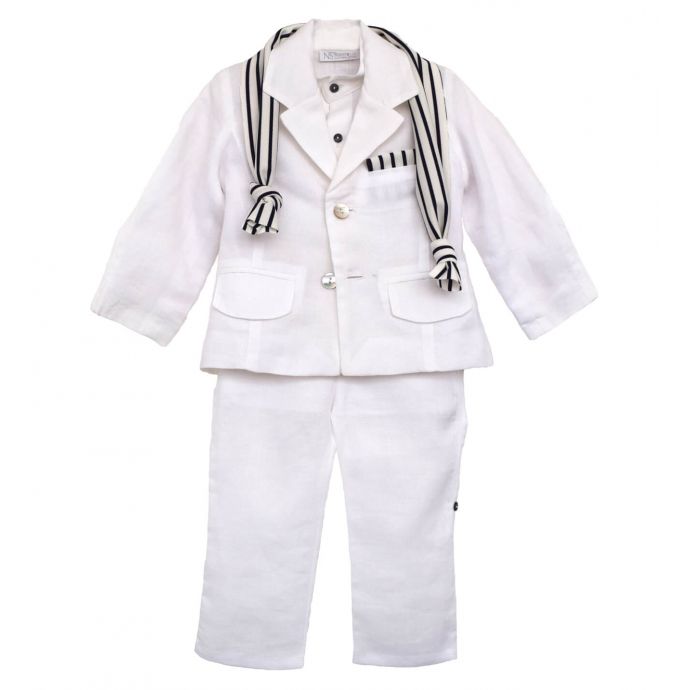 Βαπτιστικό ρούχο από λευκό σακάκι και παντελόνι βαμβακερής καπαρτίνας με βαμβακερό μάο πουκάμισο και ριγέ φουλάρι.