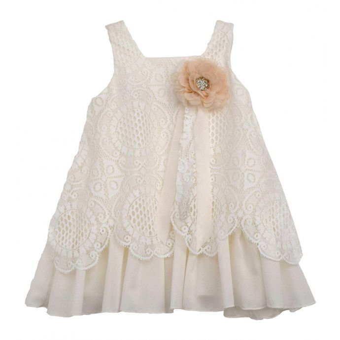 Βαπτιστικό φόρεμα από εκρού δαντέλα, βολάν από εκρού οργαντίνα στο κάτω μέρος και λουλούδι μπουτονιέρα με λεπτομέρειες από στρας.