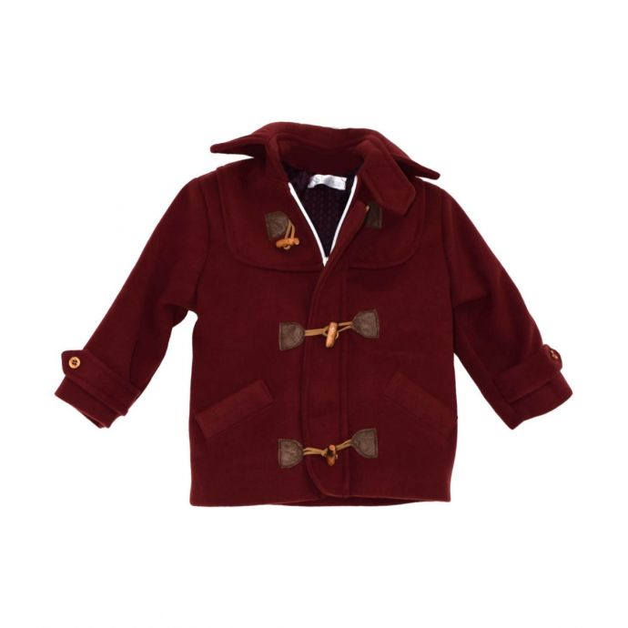Μοντγκόμερι σε μπορντό απόχρωση με καφέ δερμάτινα κουμπώματα, ξύλινα κουμπιά και μπορντό σατέν φόδρα, Παλτό, Μπουφάν, Σακάκια, Γιλέκα, βρεφικά και παιδικά, υψηλής ποιότητας. Ελληνικής παραγωγής.