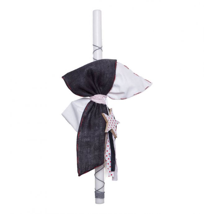 Λαμπάδα βάπτισης διακοσμημένη με διπλό φιόγκο από μπλε λινάτσα- λευκό βαμβακερό ύφασμα και ξύλινο αστέρι ντυμένο με ύφασμα αστεράκια. Ελληνικής κατασκευής.
