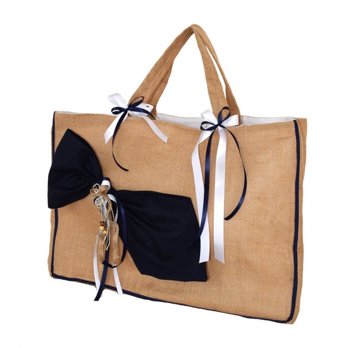 Υφασμάτινη τσάντα βάπτισης από λινάτσα, κορδέλες μπλε-λευκές και φιόγκους από μπλέ ύφασμα καπαρτίνα , ελληνικής κατασκευής.